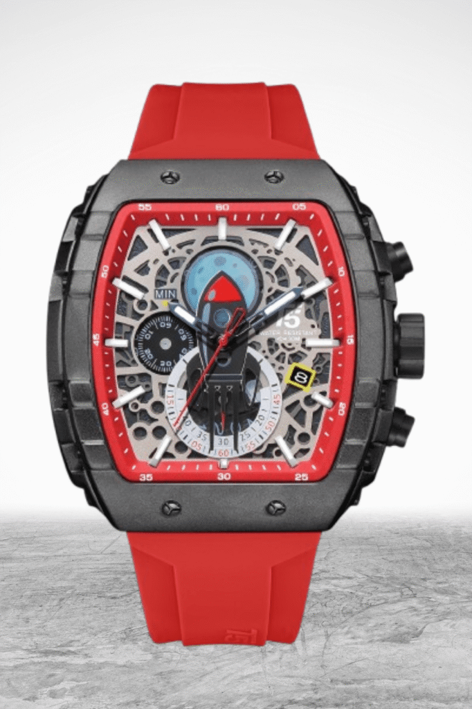 Unleash your bold style with the T5 Sports Chronograph, designed for trendsetters who demand performance and aesthetics. Featuring a robust black case, a skeleton dial, and a durable silicone strap, this watch blends cutting-edge design with precision timekeeping. Whether you're dressing up or keeping it casual, this timepiece adds a statement to your wrist.