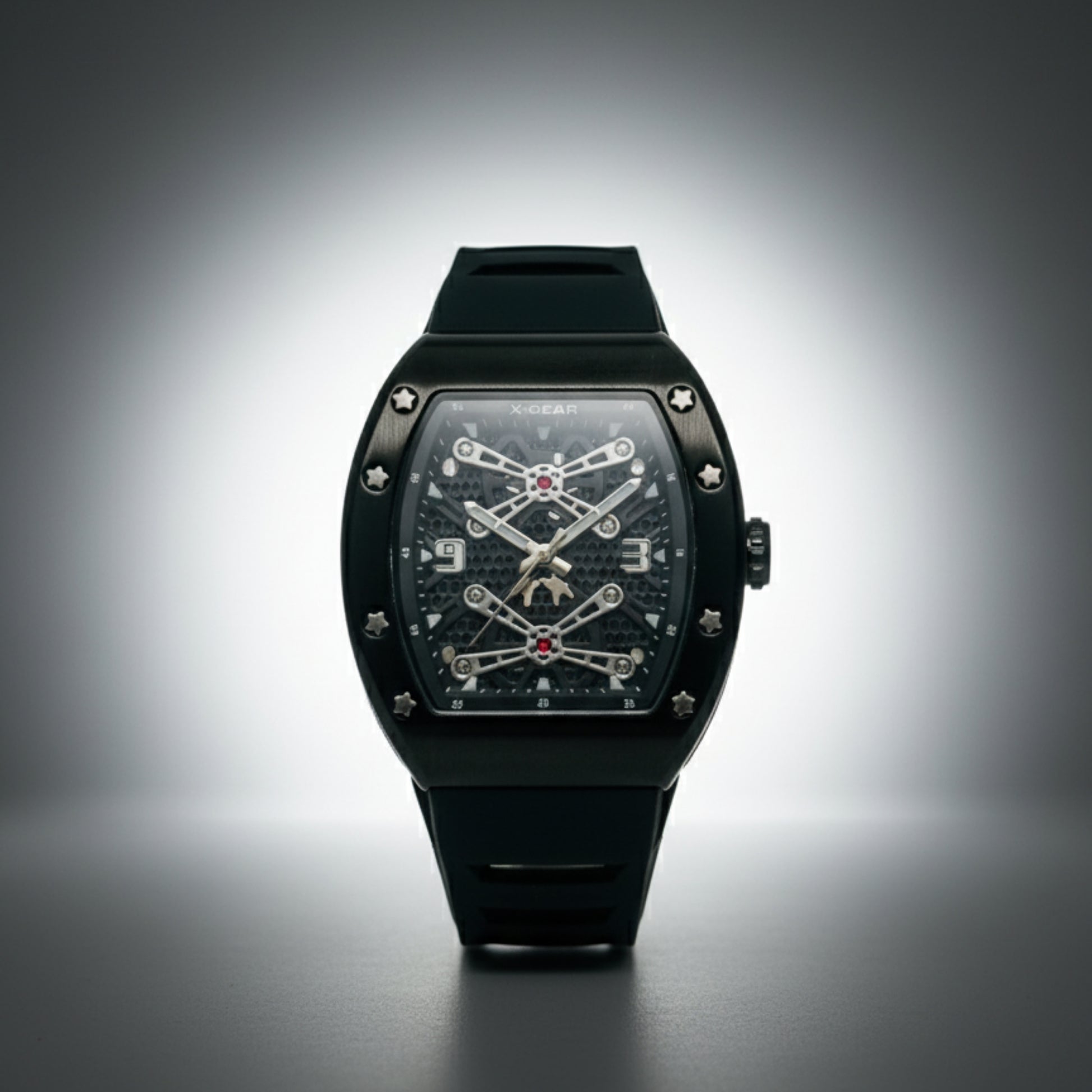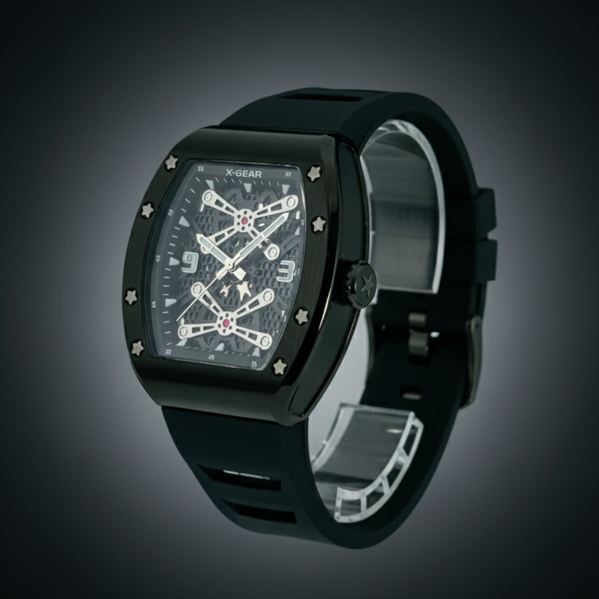 Skeleton dial watch men, Alpha X-Gear, luxury sport watch, mechanical design watch, rubber strap wristwatch, futuristic men’s timepiece, black luxury watch Pakistan