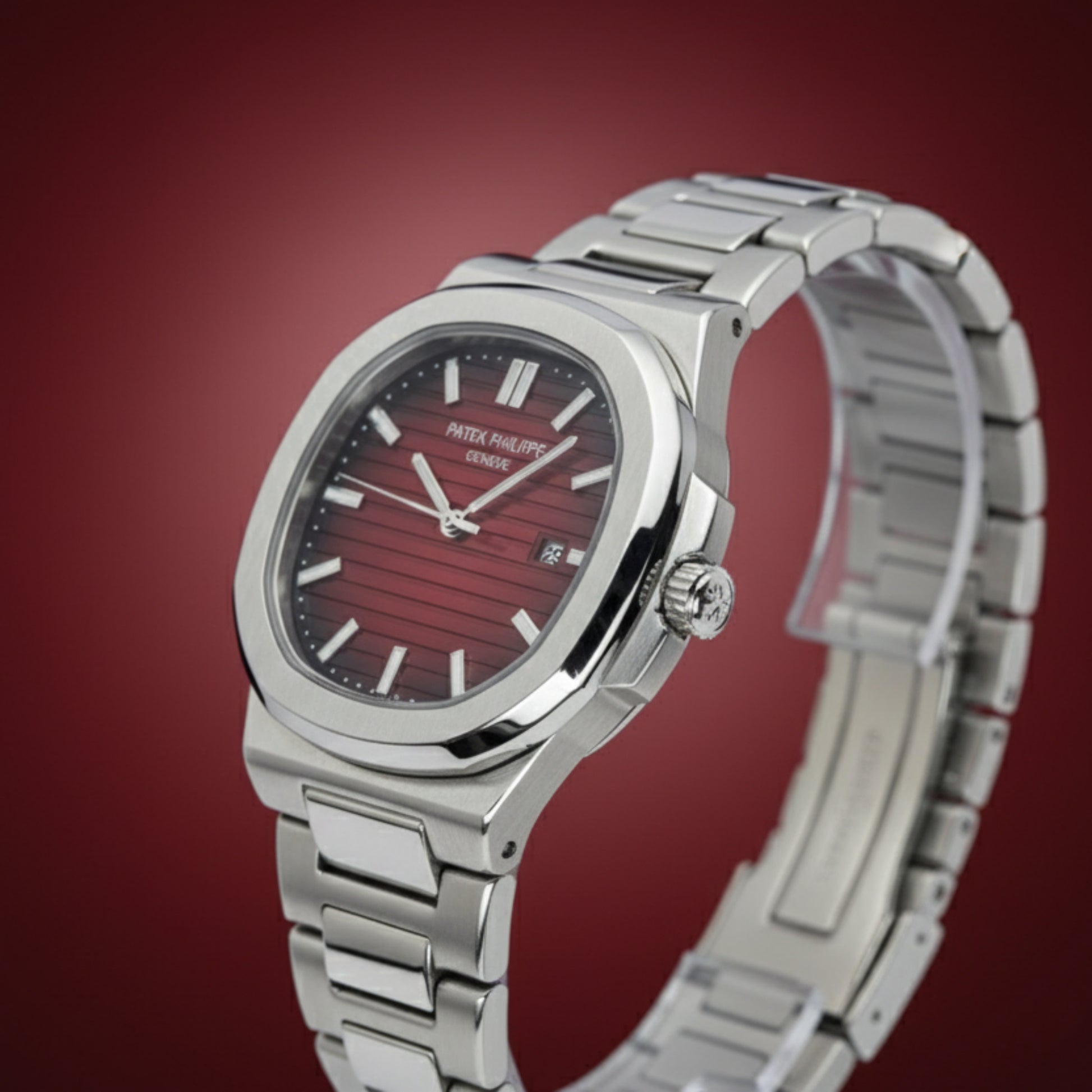 Patek Philippe inspired red dial watch, Nautilus style men’s watch, luxury silver wristwatch, red luxury watch Pakistan, stainless steel quartz watch, bold men’s timepiece