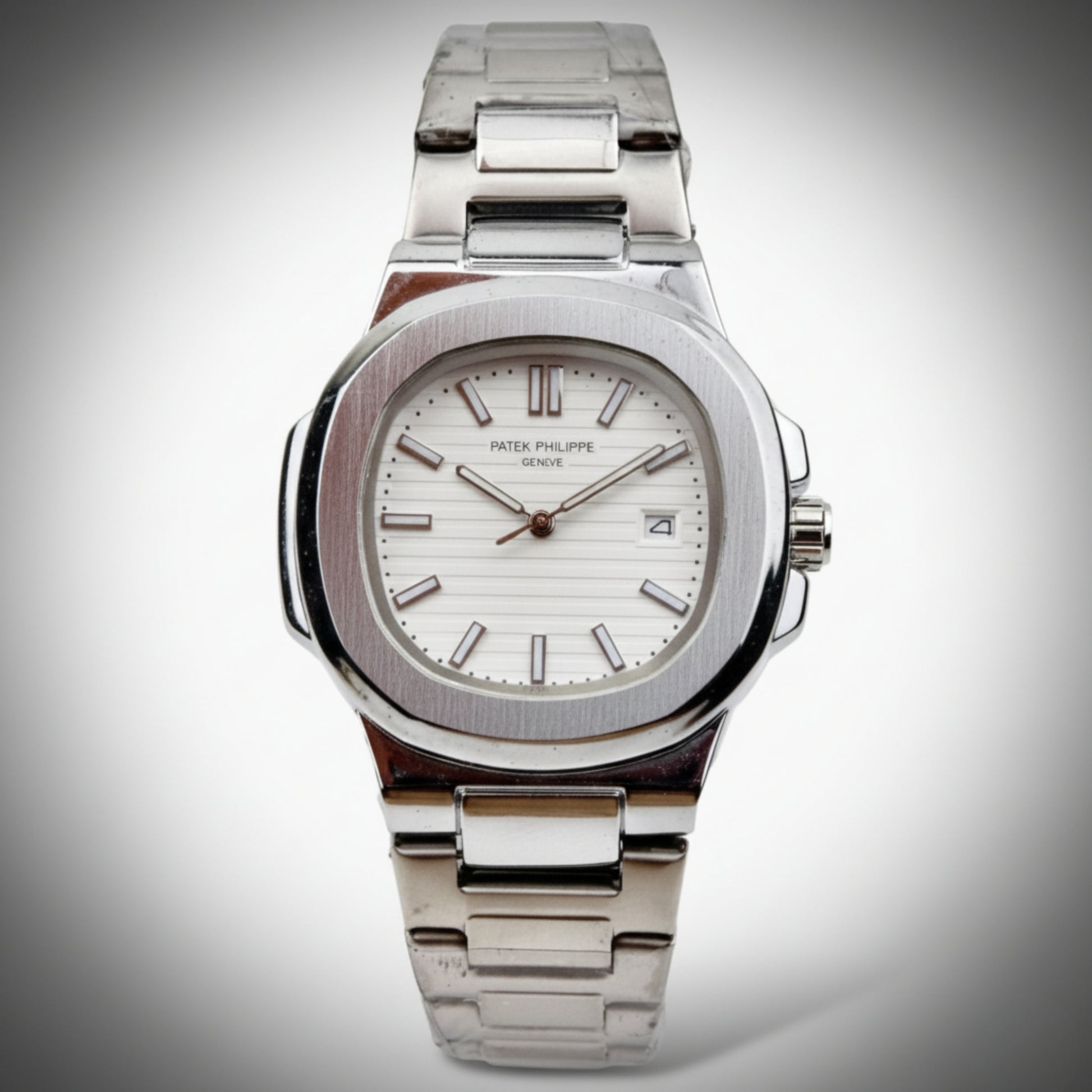Patek Philippe inspired white dial watch, Nautilus style men’s wristwatch, luxury silver quartz watch, men’s stainless steel watch, white luxury watch Pakistan, elegant men’s timepiece
