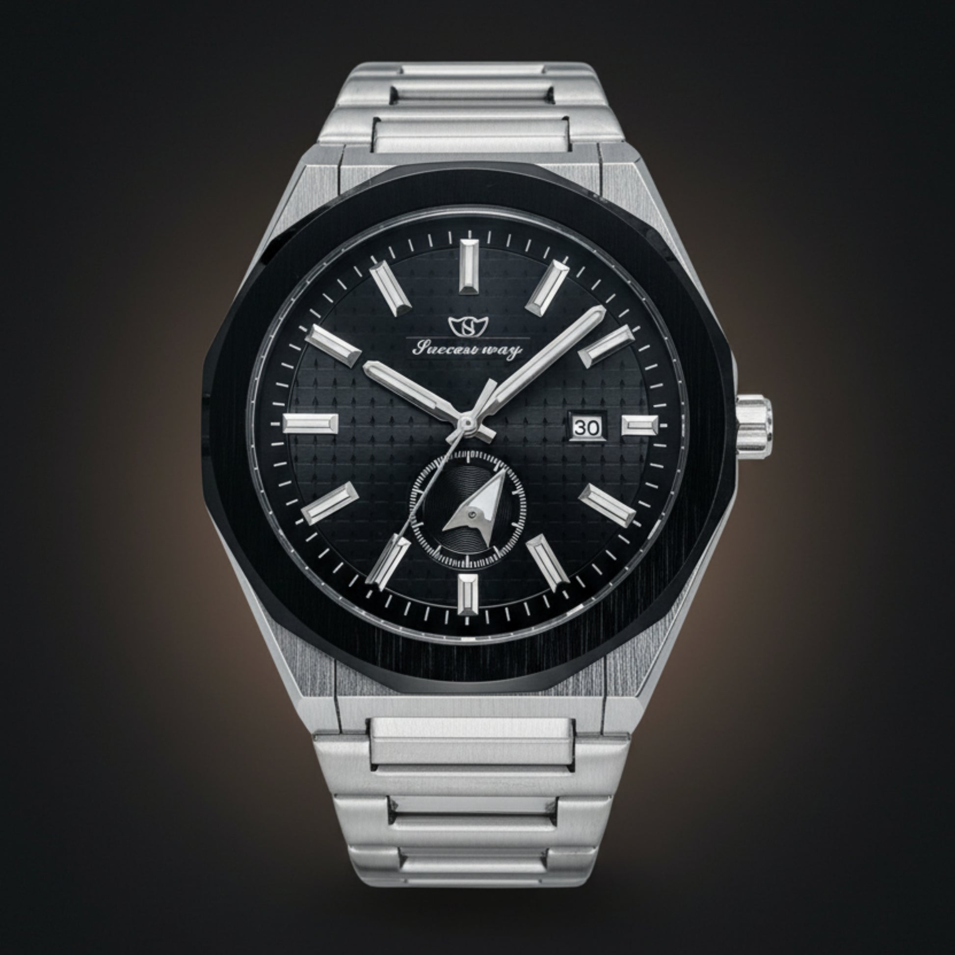 The SuccessWay Men’s Watch blends power and elegance — featuring a bold black dial, silver stainless-steel body, and a refined design perfect for both office and casual wear. Elevate your style with Alpha Watches.