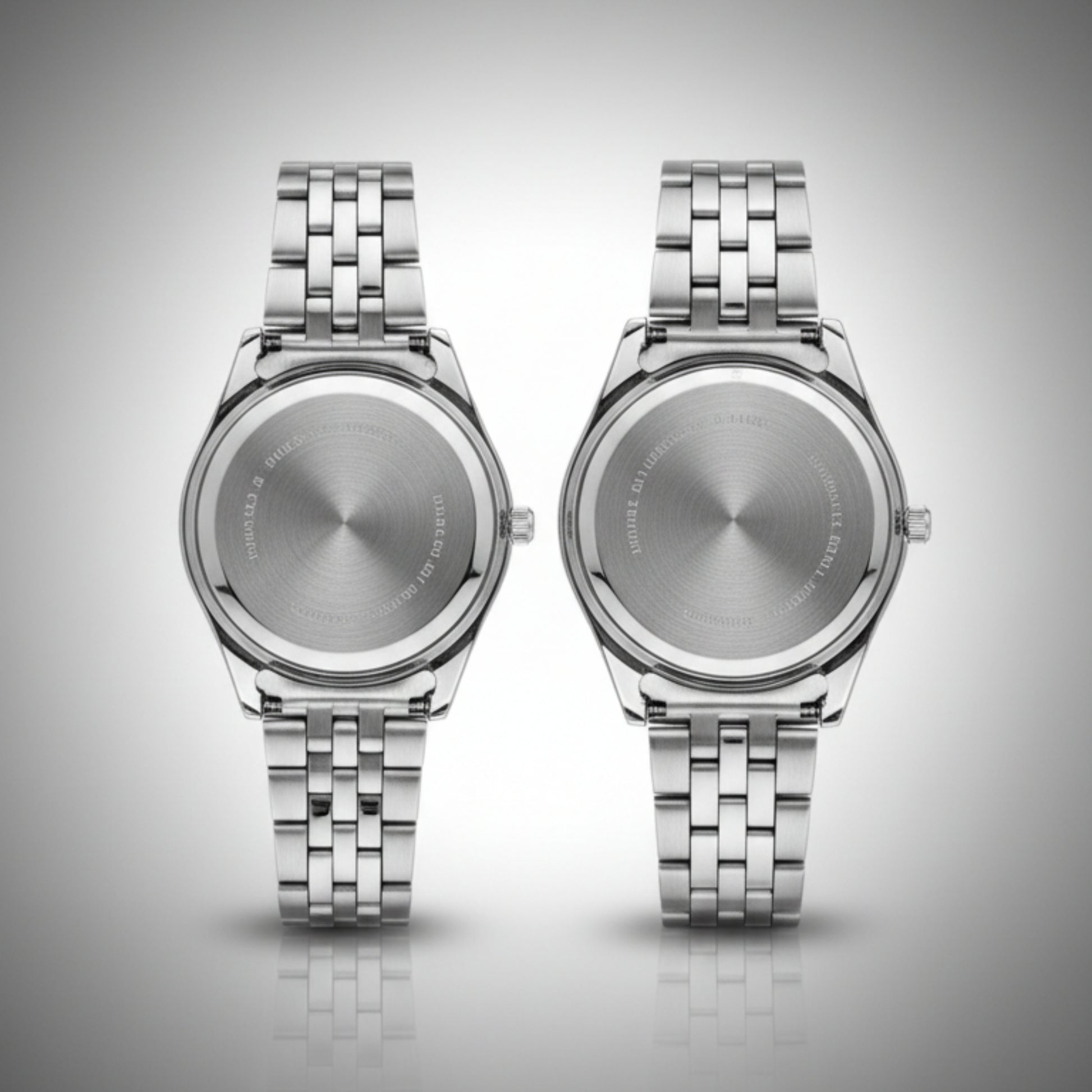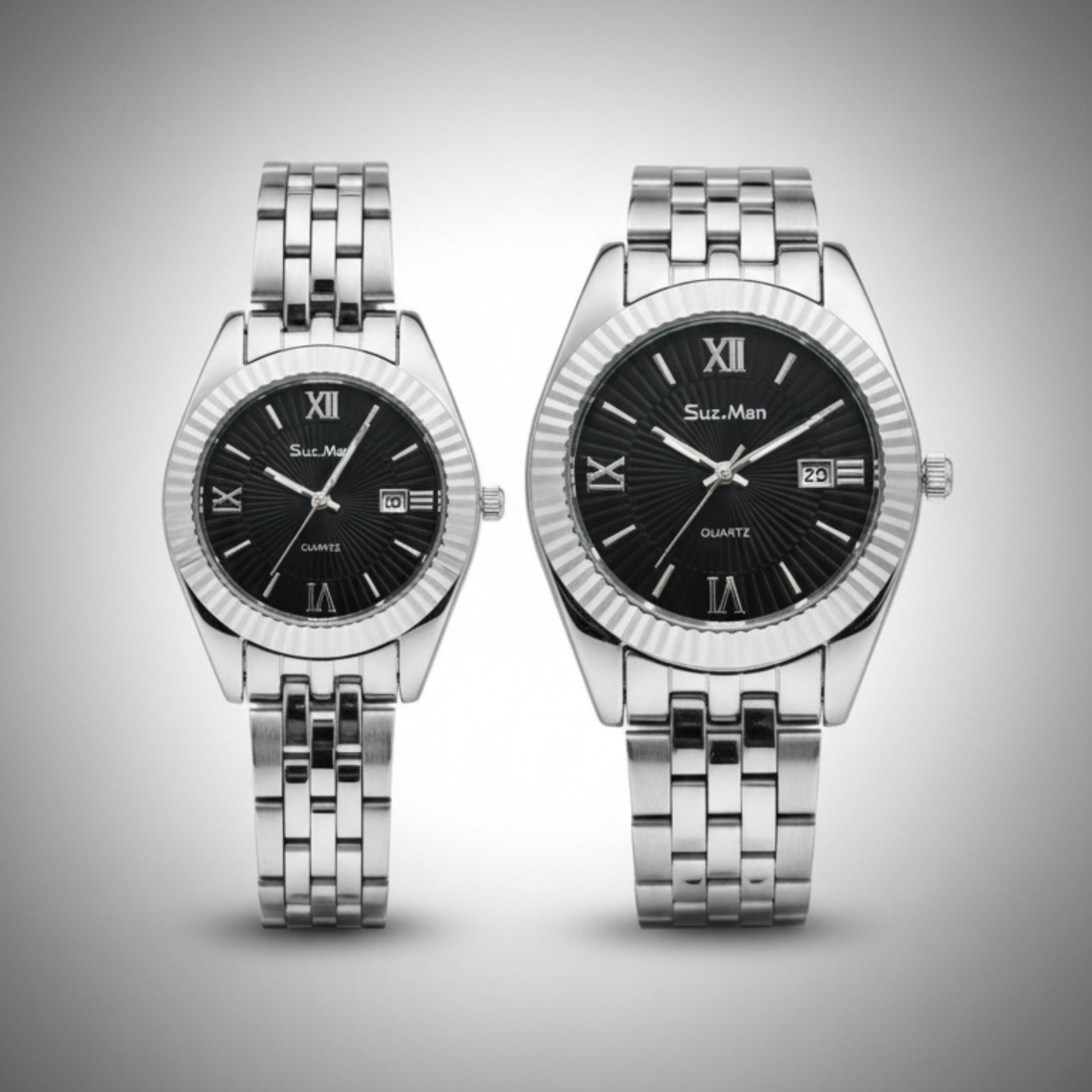 Elevate your couple style with the Suz.Man Black Dial Watch Set. A bold silver finish with a sleek black dial — designed for elegance and timeless love.